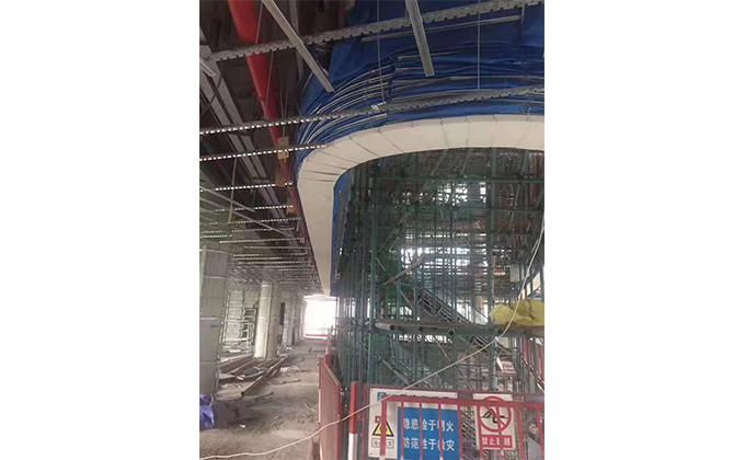擋煙垂簾垂壁根據(jù)設(shè)計(jì)要求和現(xiàn)場實(shí)際情況采取如下施工順序:首先,搭設(shè)腳手架一放線一打眼--上脹栓一焊骨架。第二,吊件一安裝骨架…